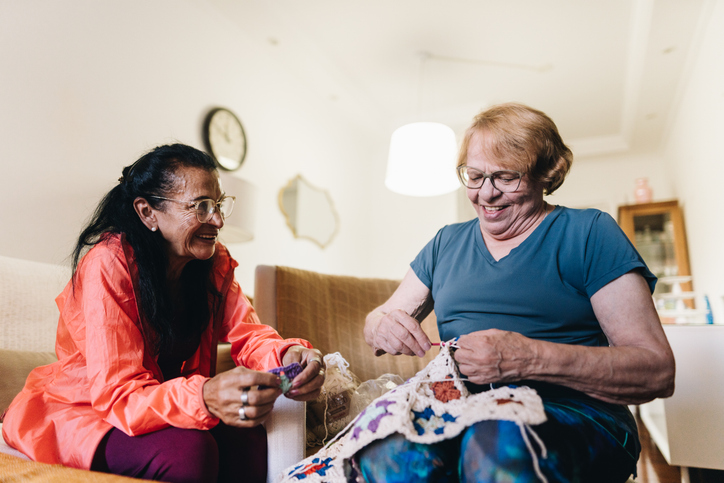 Senior friends talking and crocheting at home
